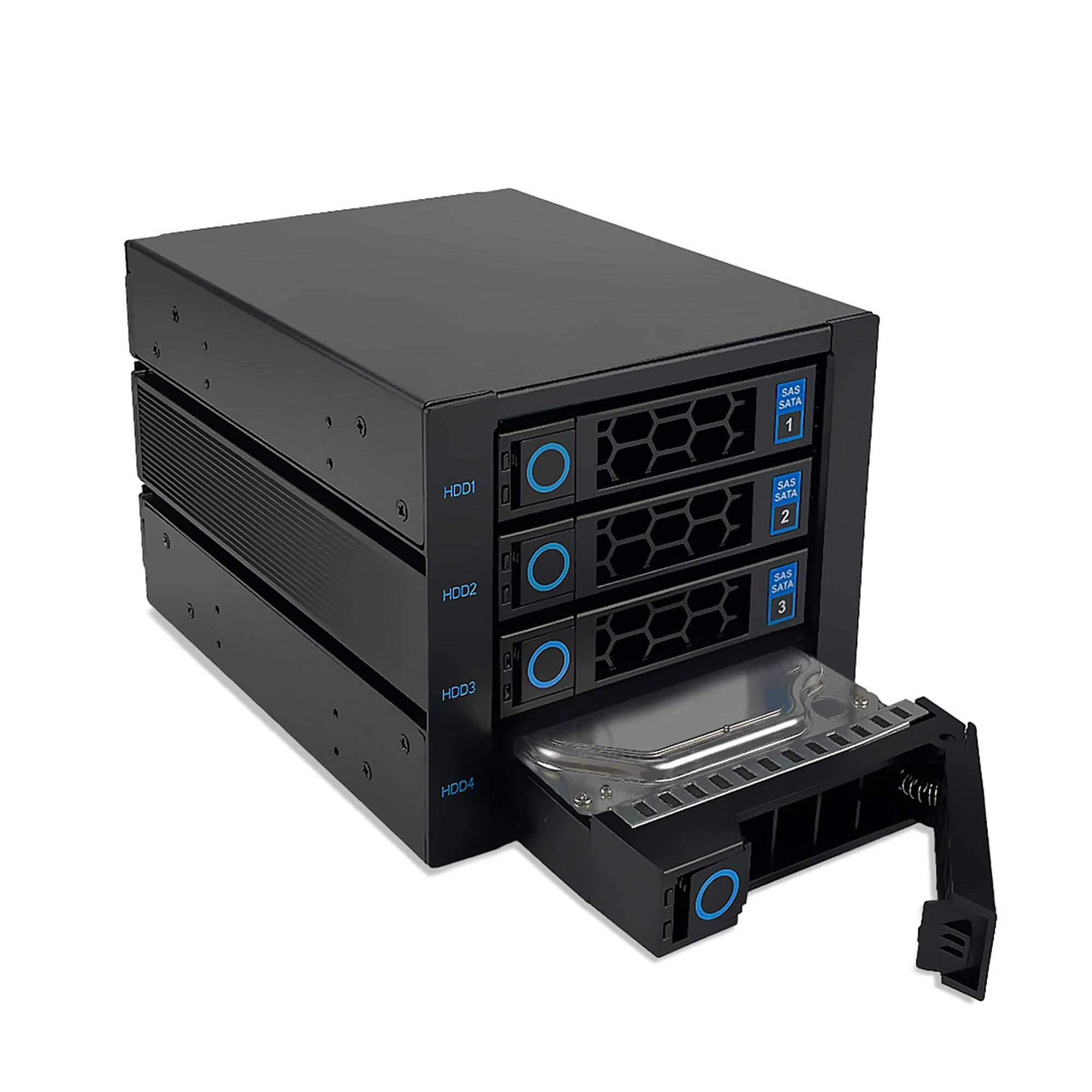 SAS I,II + SATA I,II,III Backplane für 4x 3,5""/2,5"" HDD/SSD in einem 3x 5,25"" Einschub. Mit einem 80mm Lüfter an der Rückseite. Festplattenträger. Aluminiumgehäuse und Front in schwarz.Schnelle Montage und Wechsel der Festplatten durch Verwendung von FestplattenträgernFestplattenträger für 3,5"" oder 2,5"" HDD oder SSD geeignetFür RAID geeignetPlug & PlayHotswapAbschließbarLEDs für Festplatten Status AnzeigeÜberhitzen wird signalisiertLüfterausfall wird signalisiertFür 3,5"" und 2,5"" SAS I,II 6G geeignetFür 3,5"" und 2,5"" SATA I,II,III 6G geeignet